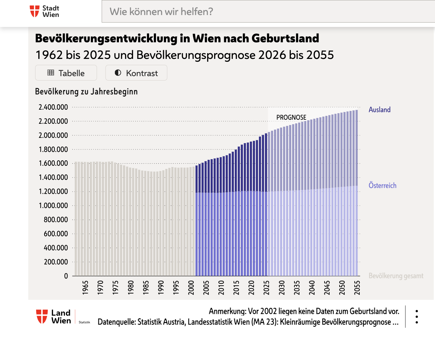 Wien war 1910 mit 2 Millionen Einwohnern noch Hauptstadt eines habsburgischen Vielvölkerreiches mit über 51 Millionen Einwohnern. Heute ist Wien mit immer noch 2 Millionen Einwohnern die wasserkopfgroße Bundeshauptstadt einer kleinen Alpenrepublik mit 9,2 Millionen Einwohnern (8 Millionen im Jahr 2000).